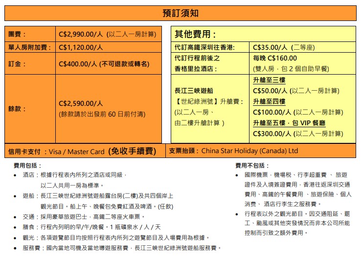 早餐後換乘小船遊覽神女溪,又稱“美女溪”,全長15公里,其中10公里為原始山谷,景色如仙境。隨後船過巫峽,奇峰突兀,幽深秀麗,分東西兩段,有金盔銀甲峽、箭穿峽、鐵棺峽、門扇峽。下午船過瞿塘峽,為三峽起點,瞿塘峽西端夔門,兩岸對峙,最窄處不足百米,亦為人民幣10元圖案。上岸遊覽「詩城」奉節白帝城,三國時劉備曾託孤於此,並因李白、杜甫吟詠而聞名。* * 晚上觀看船上文藝演出 **