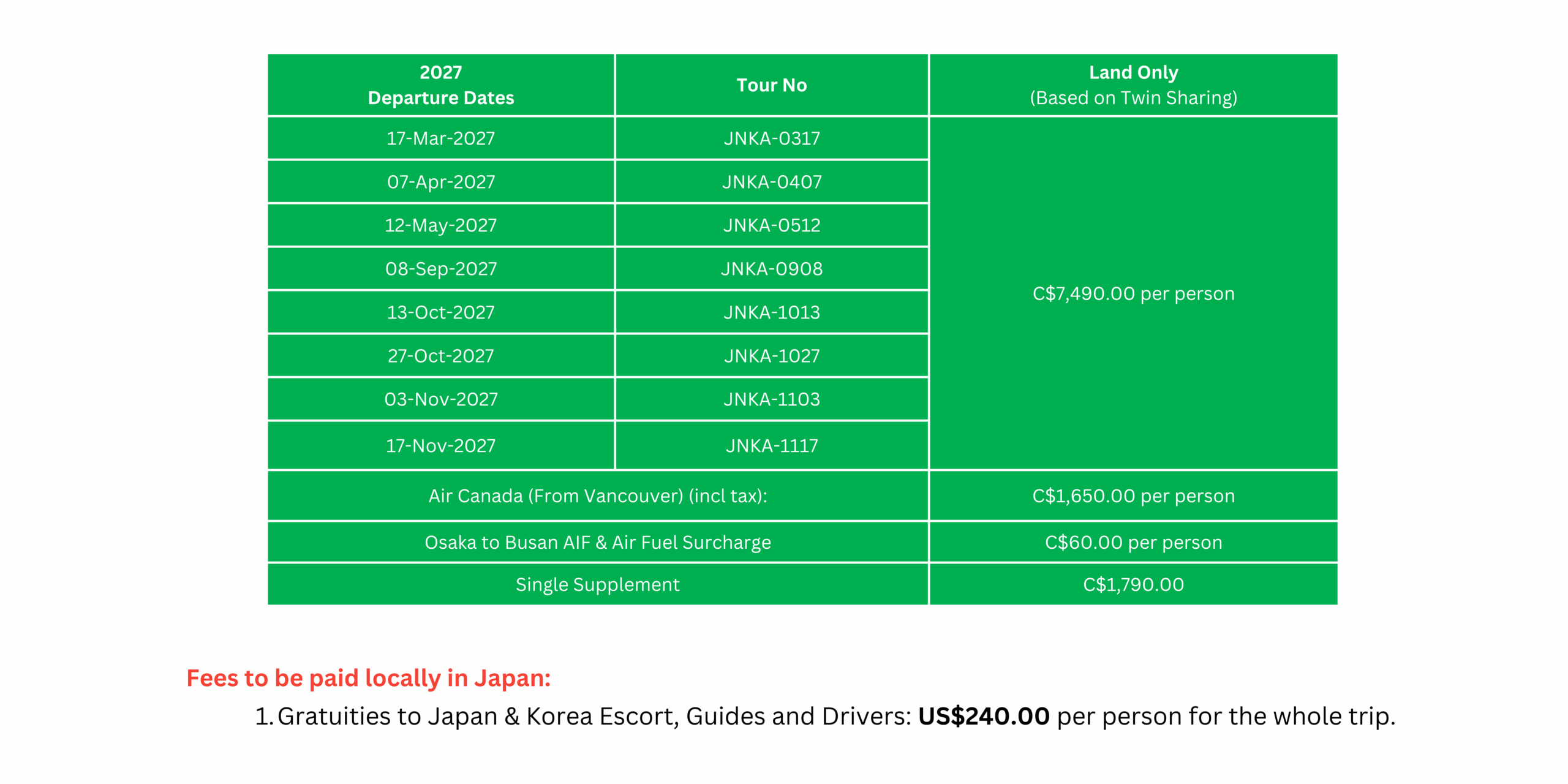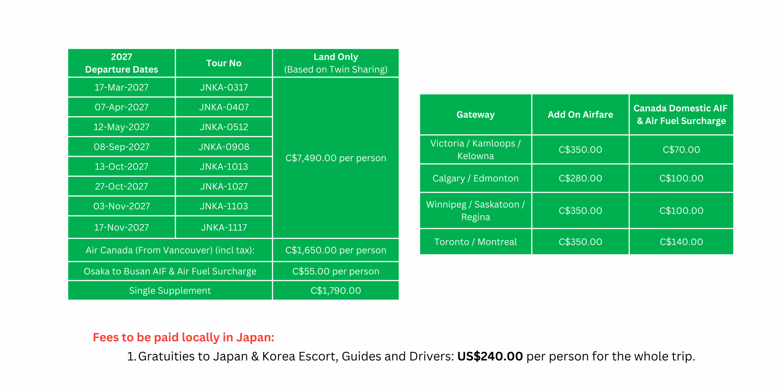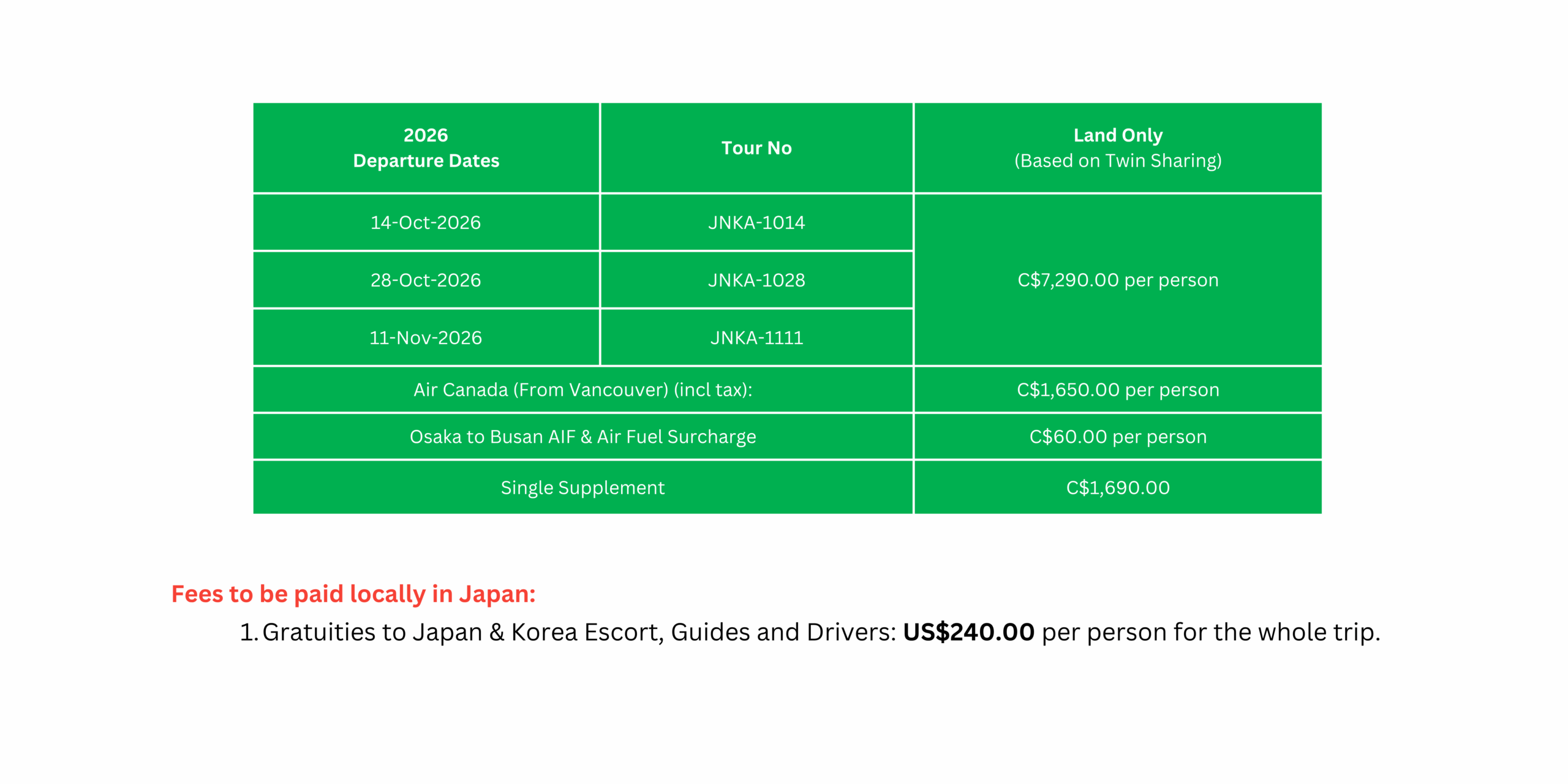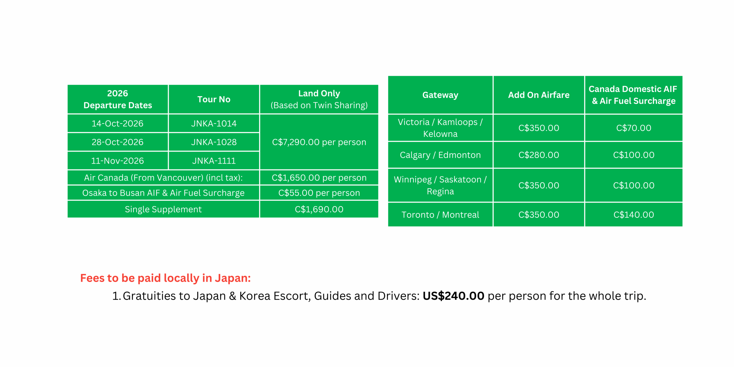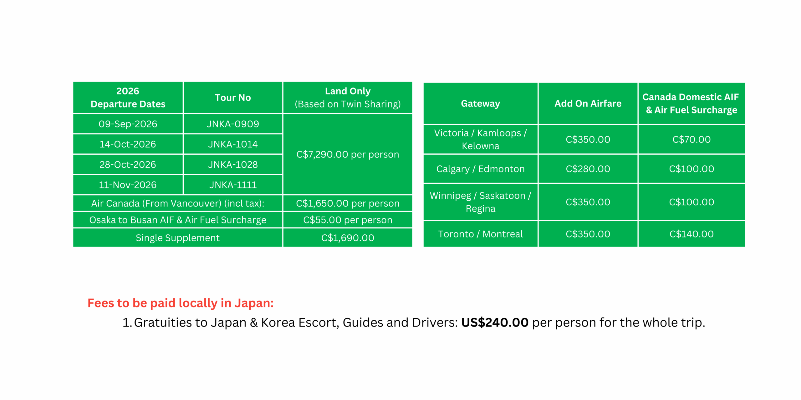 Fly with Air Canada non-stop flight from Vancouver to Tokyo. Start your worry-free vacation with our Canadian Tour Leader.