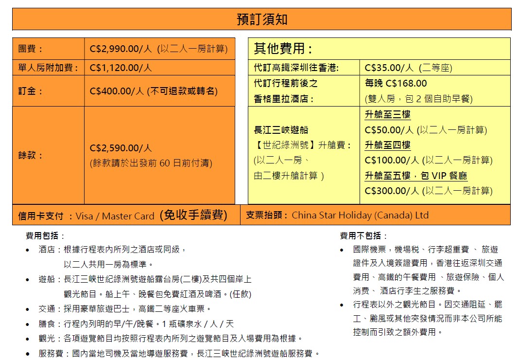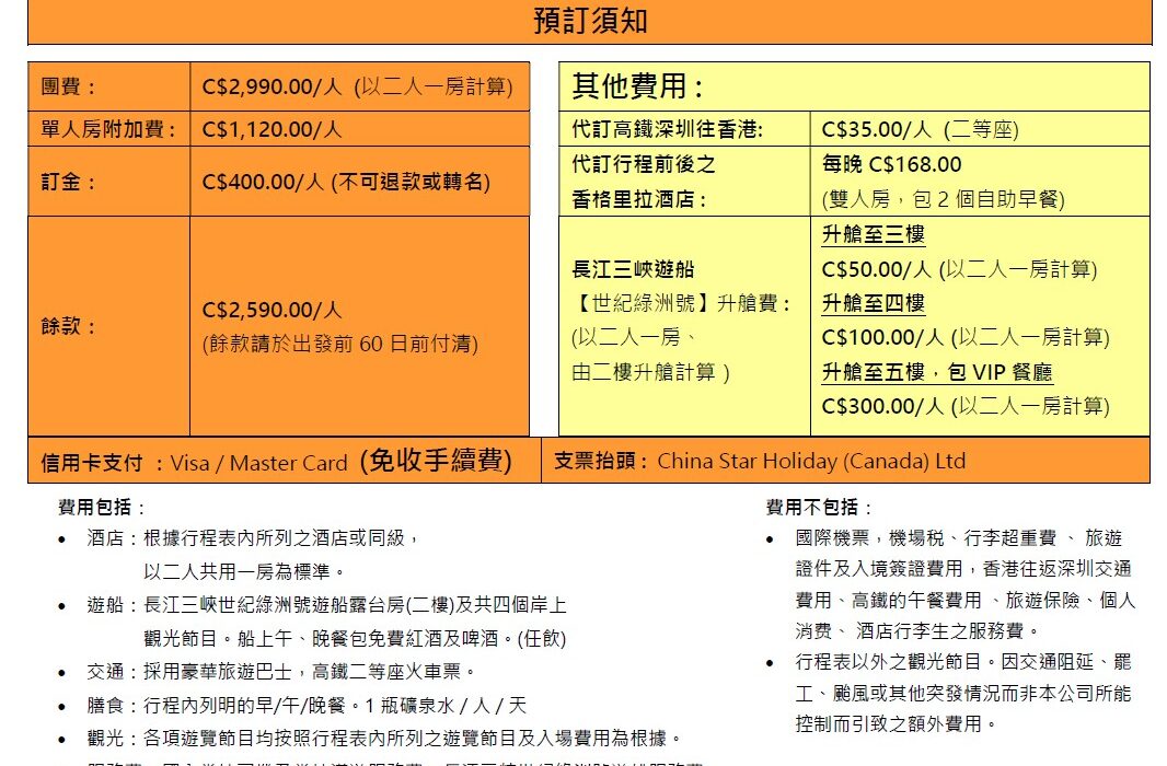 早餐後換乘小船遊覽神女溪,又稱“美女溪”,全長15公里,其中10公里為原始山谷,景色如仙境。隨後船過巫峽,奇峰突兀,幽深秀麗,分東西兩段,有金盔銀甲峽、箭穿峽、鐵棺峽、門扇峽。下午船過瞿塘峽,為三峽起點,瞿塘峽西端夔門,兩岸對峙,最窄處不足百米,亦為人民幣10元圖案。上岸遊覽「詩城」奉節白帝城,三國時劉備曾託孤於此,並因李白、杜甫吟詠而聞名。* * 晚上觀看船上文藝演出 **